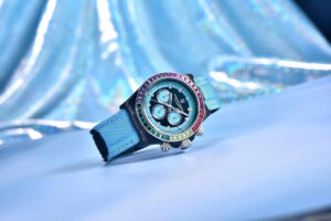 Thiết kế mặt số thanh lịch kết hợp viền bezel cầu vồng độc đáo, tạo điểm nhấn nổi bật
