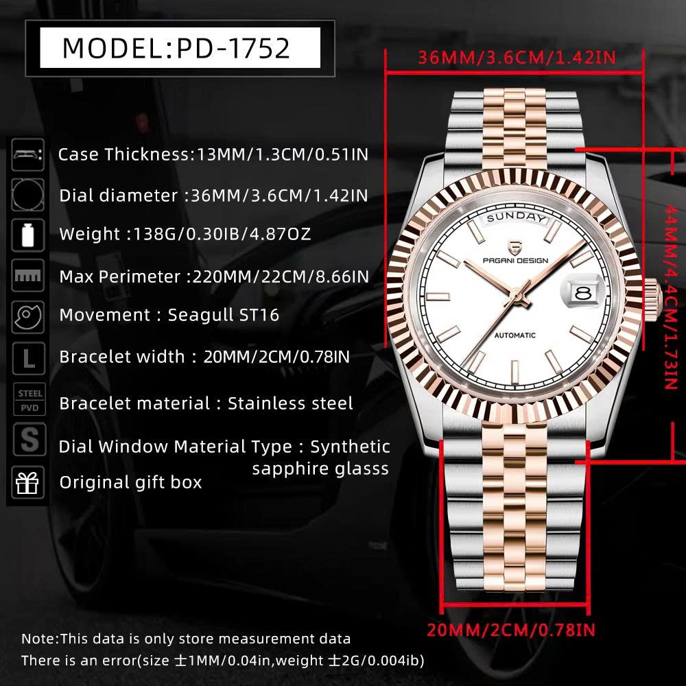 Đồng Hồ Nam PAGANI DESIGN PD‑1752 – Seagull ST16 Day-Date 36 mm, Bảo Hành 3 Năm