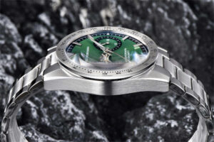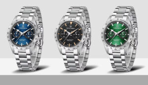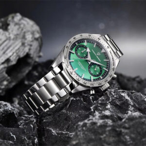 Thiết kế homage Speedmaster ’57, mặt số sunburst xanh/đen/lục kết hợp bezel chrono đặc trưng