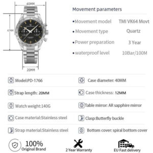 Pagani Design PD-1766, quartz chronograph – máy Seiko, vỏ thép, kính sapphire, lịch ngày, chống nước 100 m, thiết kế sang trọng & thể thao.