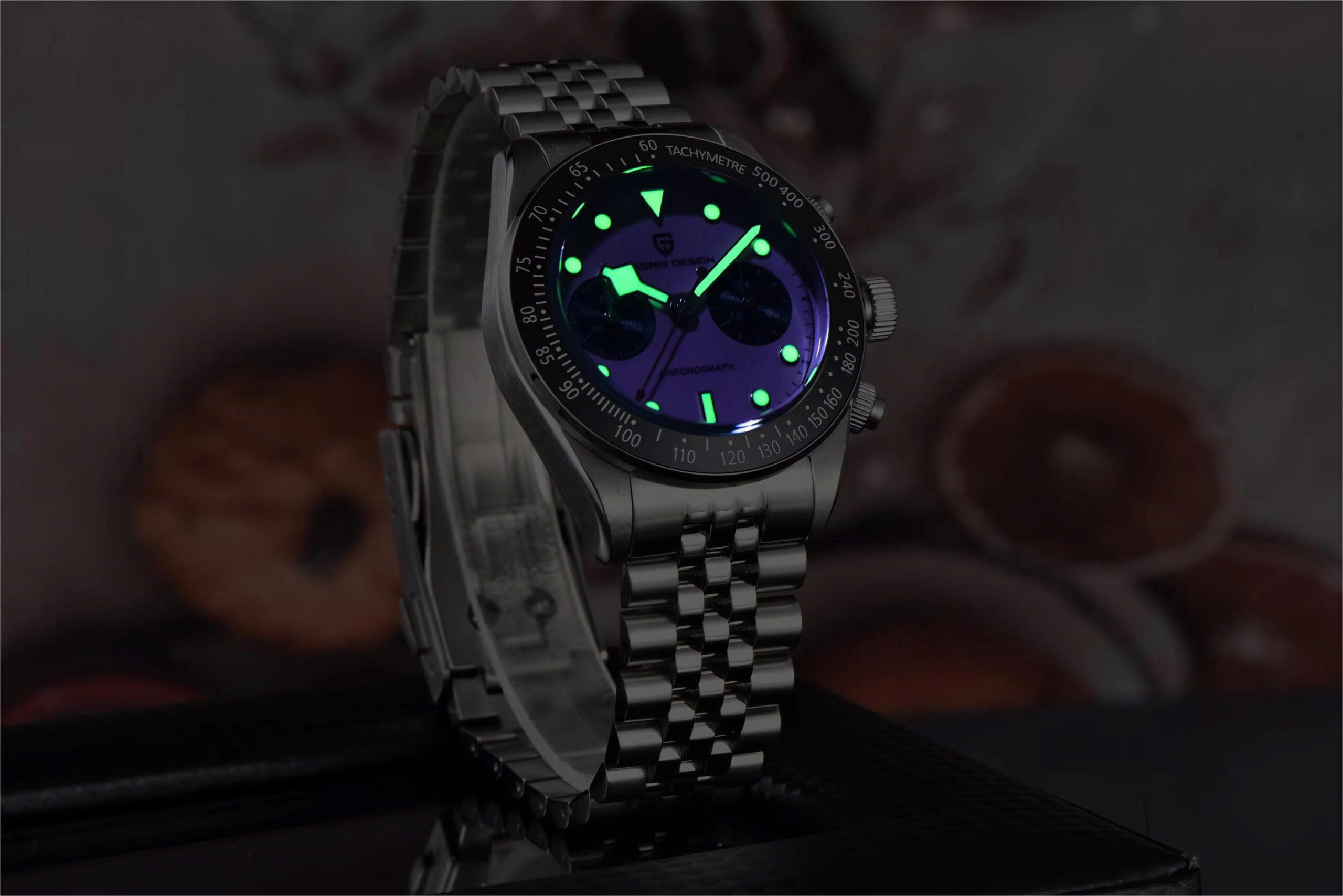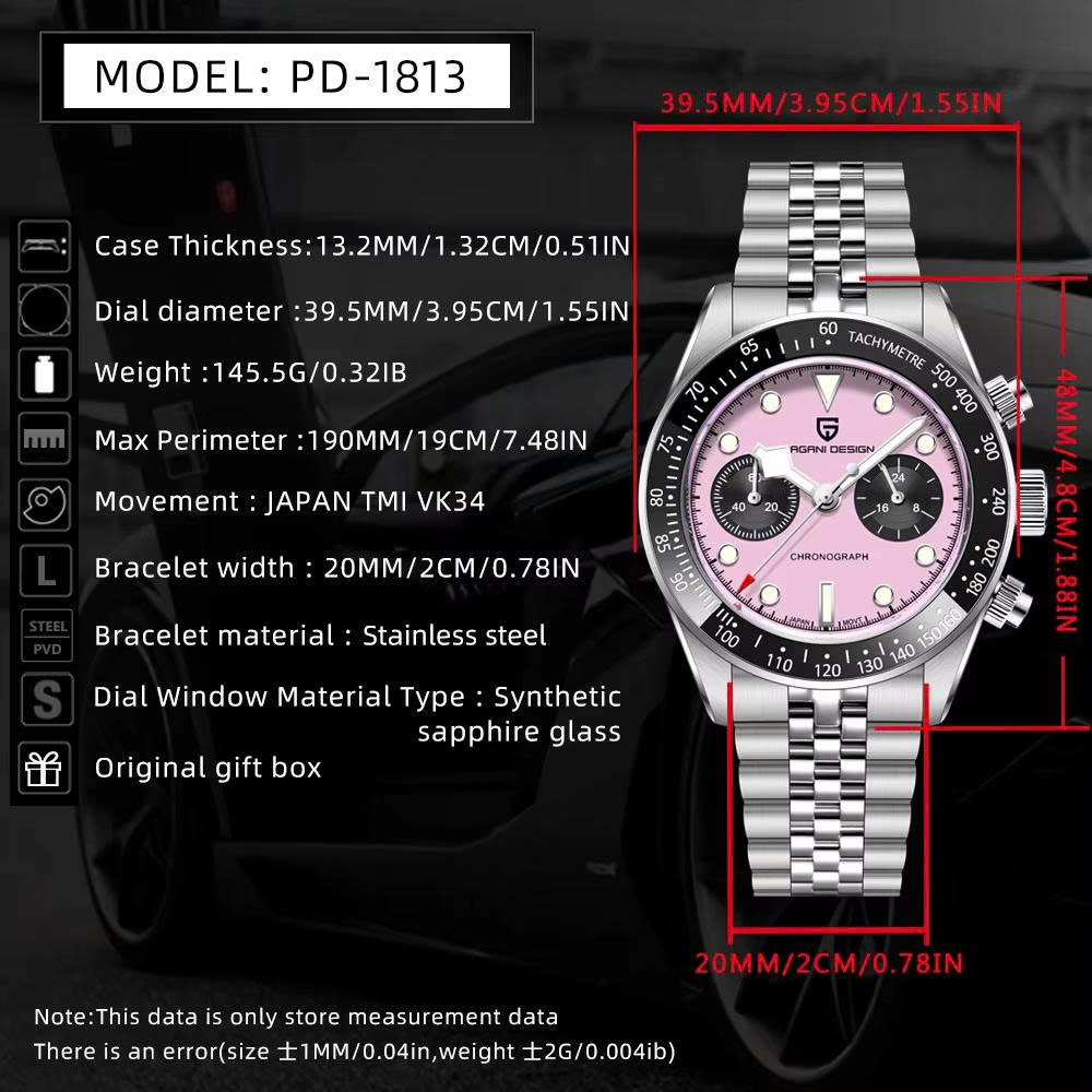 Pagani Design PD‑1813 Flamingo, chronograph quartz, bezel thể thao, kính sapphire, vỏ thép không gỉ, chống nước 100M – phong cách sang trọng & mạnh mẽ.