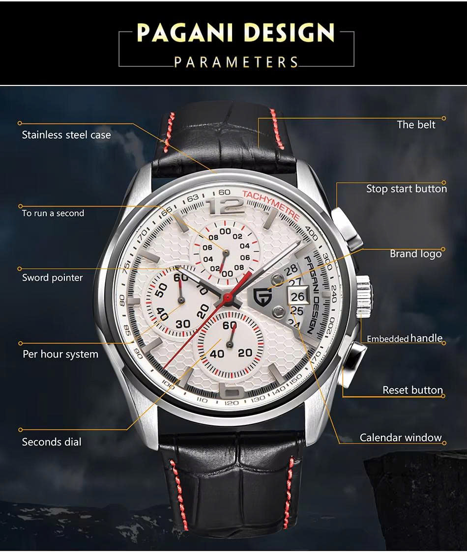 Đồng Hồ Nam PAGANI DESIGN PD-3306 – Máy Quartz Chronograph, Size 44.5mm, Dây Da, Kính Hardlex, Chống Nước