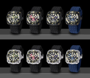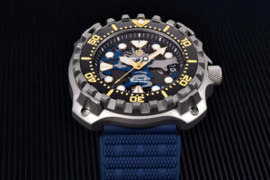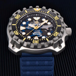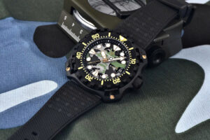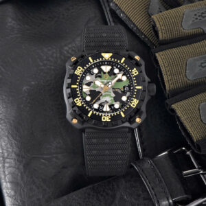 Vỏ diver “military camo” mạnh mẽ, mặt lộ cơ độc đáo kết hợp với kính trong suốt tạo điểm nhấn “camo skeleton”