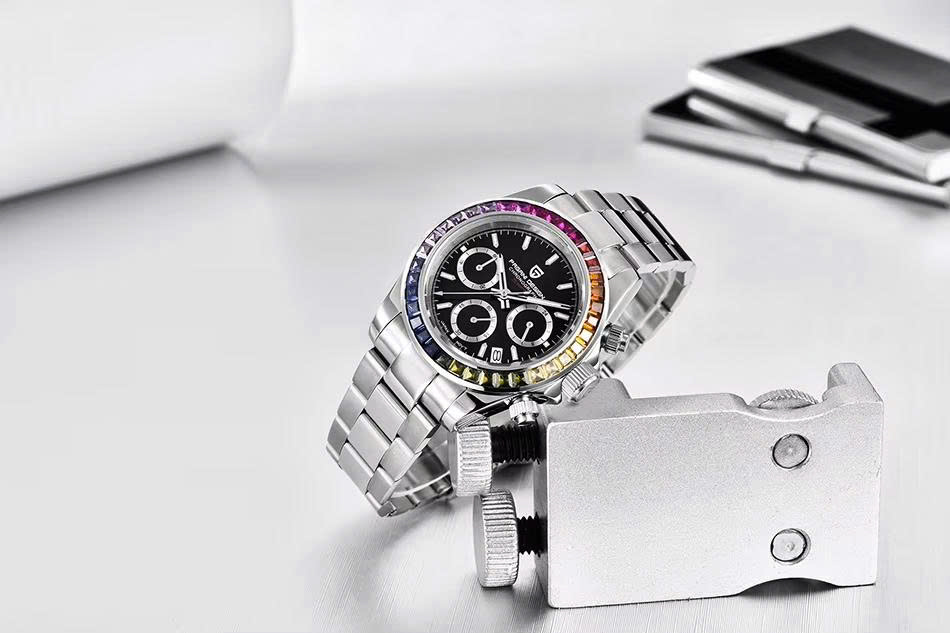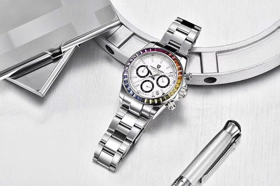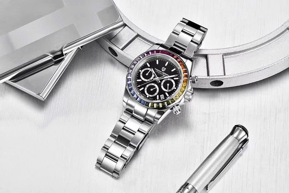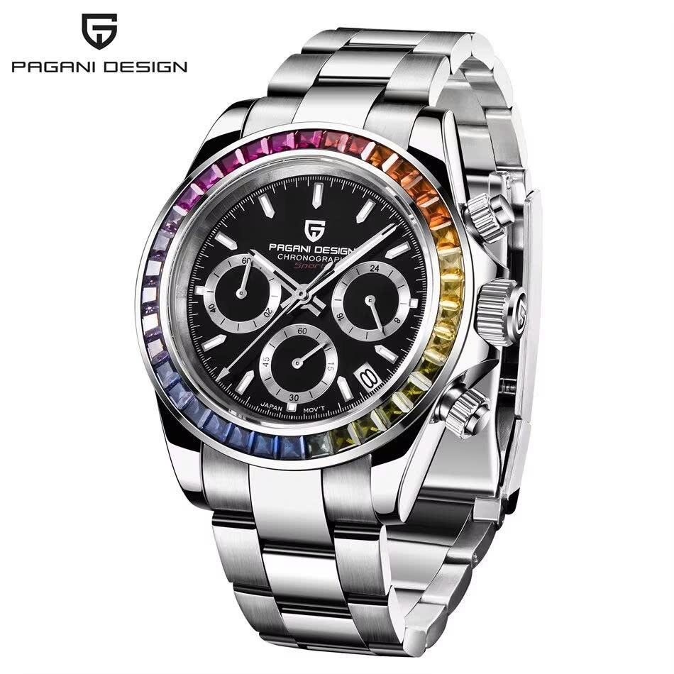 Pagani Design PD-1644 Rainbow máy quartz VK63, chronograph thể thao, vành bezel ceramic đa sắc, kính sapphire, dây thép không gỉ, chống nước 100M.